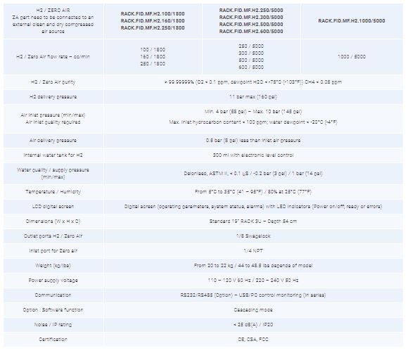 This unit can provide both hydrogen gas and zero grade air to FID detectors and Carrier gas on Gas Chromatographs. Hydrogen gas is produced from deionised water using the exclusive 100% titanium Proton Exchange Membrane (PEM) technology for H2, which provides a very high purity reliability and new longer life. Zero air is produced by purifying compressed air sourced from the air network to a total hydrocarbon concentration of < 0.05 ppm (measured as methane). The RACK.FID. MF.H2 generator combines the hydrogen serie MF.H2 and Zero air serie