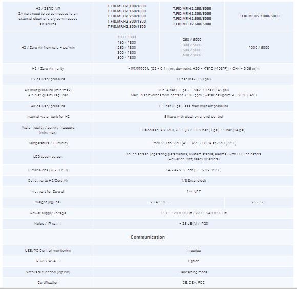 The T.FID.MF.H2 generator combines the hydrogen serie MF.H2 and Zero air serie ZA generators in one unit. The touch screen LCD interface provides simple and user friendly management of all functions on the unit.